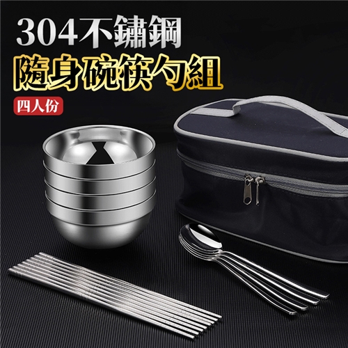 304不鏽鋼碗筷組 旅行裝 四人份 便攜餐具組 附提袋 戶外 露營 隨身餐具 4人碗勺筷 opc218